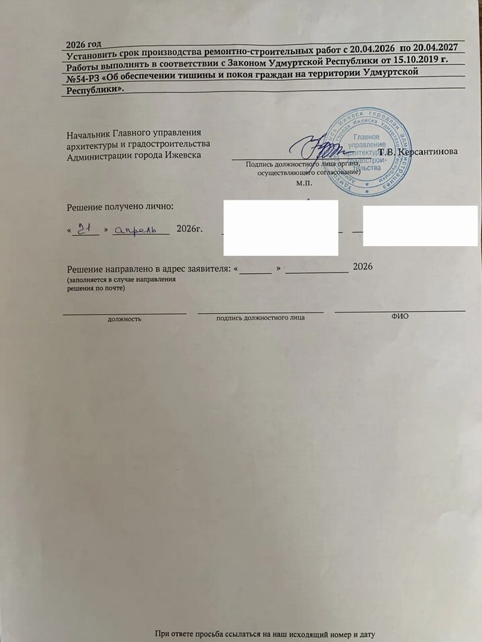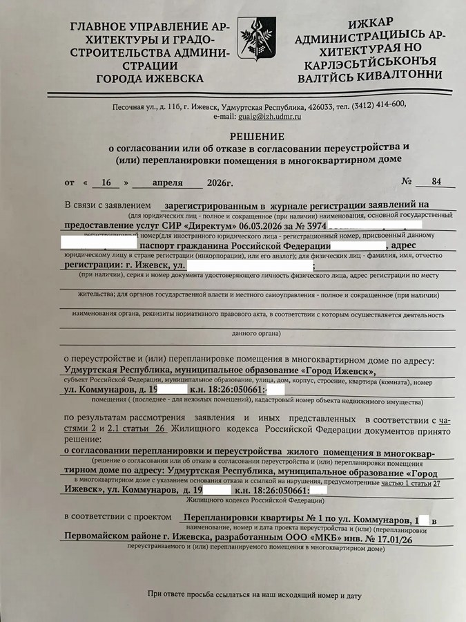 Нами получено очередное разрешение на перепланировку жилой квартиры. Для заказчика мы выполнили работу в полном объеме «под ключ». Специалисты ООО «Архитектурная мастерская Шайхутдинова и Ко» собрали исходные данные, разработали проектную документацию, предварительно согласовав его с соответствующими инстанциями. На основании комплекта документов и проекта мы получили от Администрации города Ижевск разрешение на перепланировку жилой квартиры расположенной по адресу: город Ижевск, ул. Коммунаров 193.