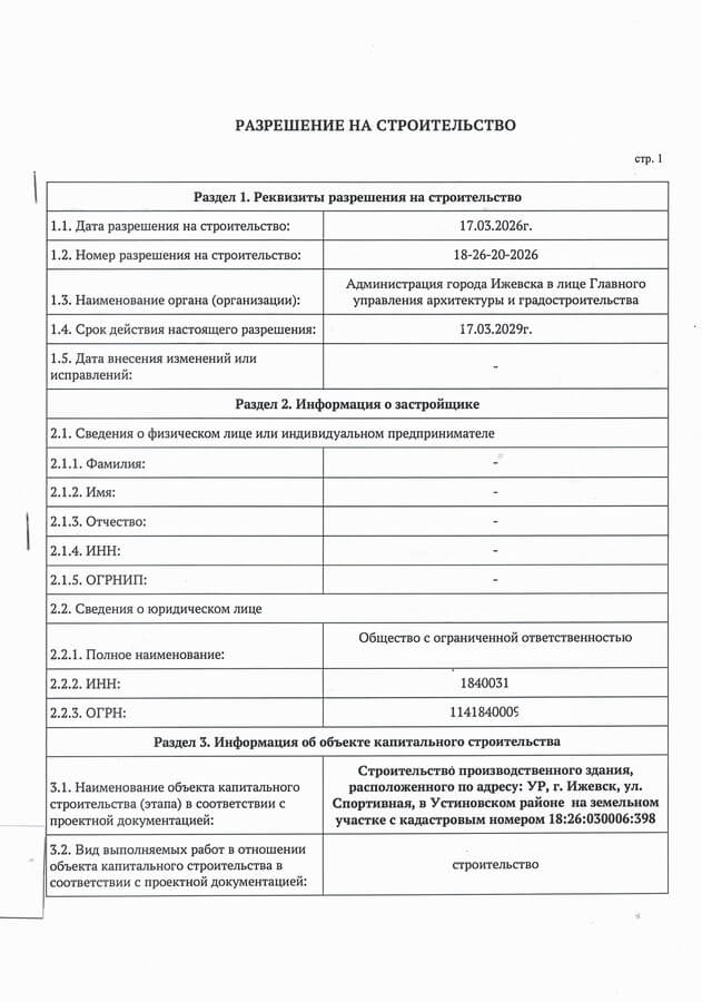 Получено разрешение на строительство производственного здания по ул. Спортивная в городе Ижевске УР!