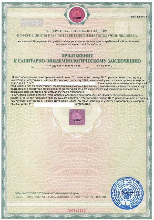 Получено санитарно-эпидемиологические заключения на соответствие государственным санитарно-эпидемиологическим правилам и нормативам от Управления Федеральной службы по надзору в сфере защиты прав потребителей и благополучия человека по Удмуртской Республике (Управление Роспотребнадзора по Удмуртской Республике) на проектную документацию, разработанную специалистами ООО «Архитектурная мастерская Шайхутдинова и Ко».