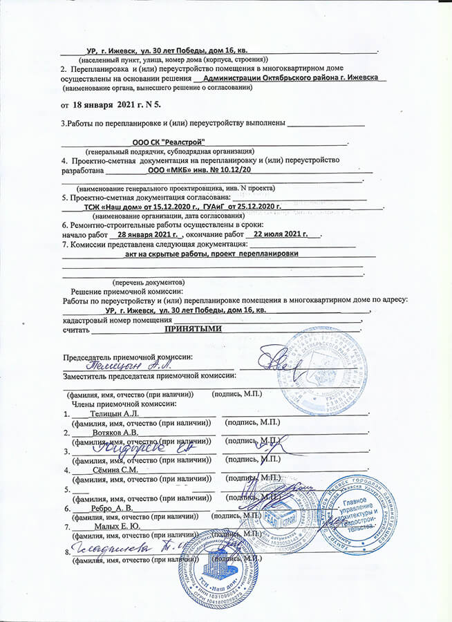 Сдали перепланировку квартиры по акту приемочной комиссии в Октябрьском районе города Ижевска!