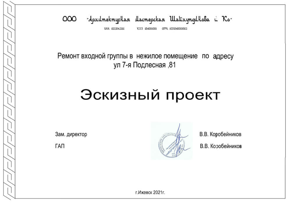 Мы разработали и согласовали с Администрацией города Ижевска, в лице Главного управления архитектуры и градостроительства эскизный проект для капитального ремонта входной группы в нежилое помещение по ул. 7 Подлесная, 81 в Октябрьском районе города Ижевска. Теперь в нашем городе станет еще на один симпатичный магазинчик больше, благодаря и нашим усилиям. Далее, для заказчика, мы займемся получением разрешения на строительство входной группы.