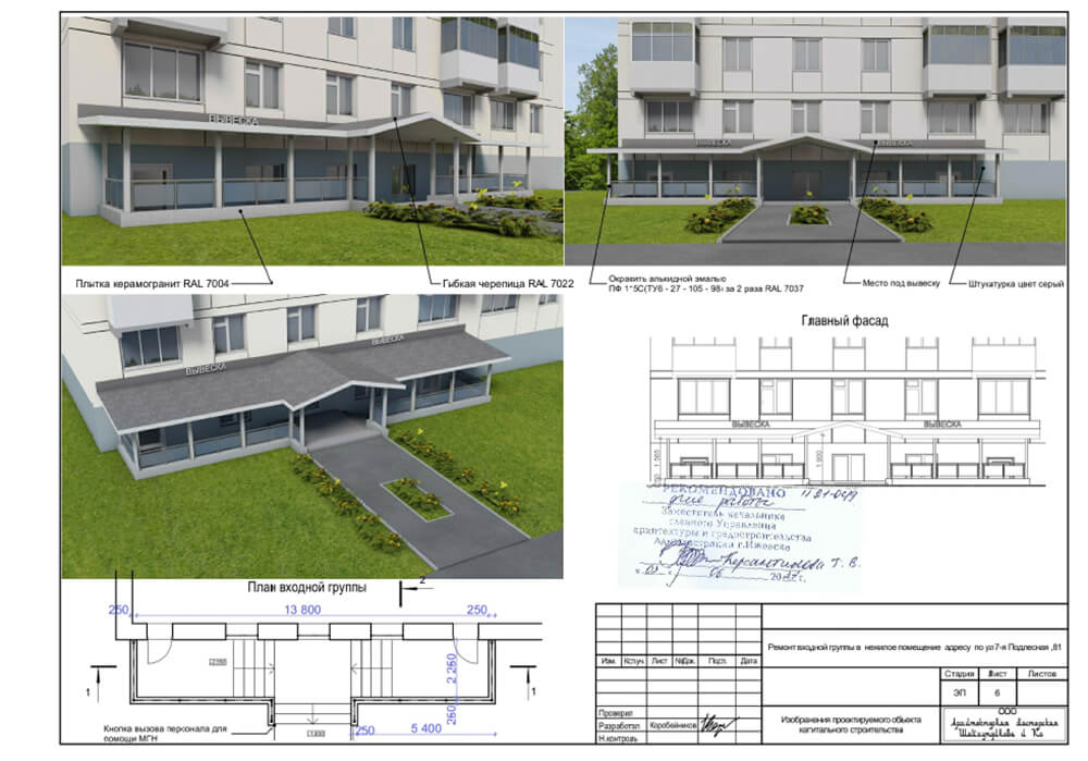 Нами получено разрешение на строительство входной группы в нежилое помещение. Наши архитекторы разработали эскизный проект входной группы, конструктора изготовили рабочий проект. И соответственно оба проекта прошли согласование с Администрацией города, Администрацией Ленинского района города Ижевска и с сетевыми организациями города. На основании предоставленных нашими специалистами документации, комиссия по выдаче разрешений на земляные работы в Администрации Ленинского района города Ижевска, приняла решение о выдаче разрешение на строительство входной группы в нежилое помещение. Заказчик удовлетворен качеством нашей работы!