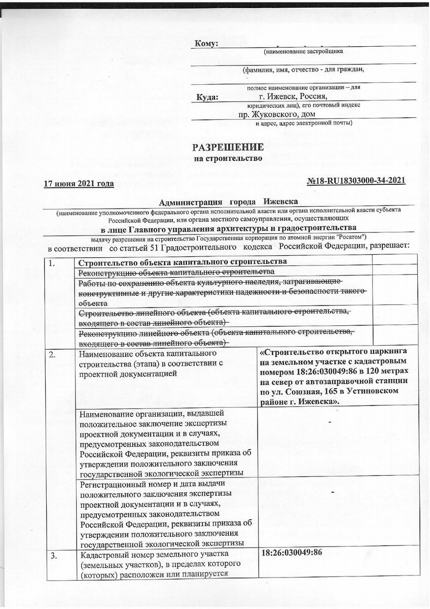 Сегодня нашему заказчики, мы вручили разрешение на строительство открытого паркинга по ул. Союзная, 165 в городе Ижевске общей площадью 1500 м2. На объекте мы занимались всей подготовительной работой, а именно рабочий и эскизный проект, собрали данные для проекта установления Санитарно-защитной зоны объекта. Мы получили согласование с Управлением Роспотребнадзора по Удмуртской Республике, Администрацией города Ижевска. Была проделана огромная работа. На основании проектной и сопроводительной документации Администрация города в лице Главного управления архитектуры и градостроительства города Ижевска выдало разрешение на строительство!