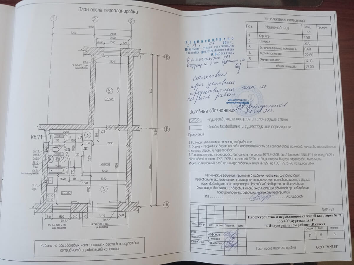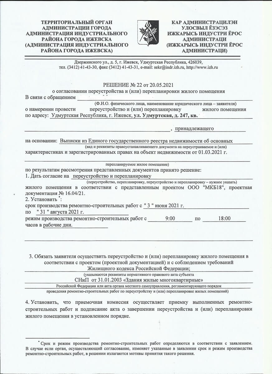 Нашей компанией получено очередное разрешение на перепланировку жилой квартиры в Индустриальном районе города Ижевска. Квартира принадлежит заказчику из города Воткинск. Заказчик предоставил доверенность на проведение работ и осуществлял контроль над работой по объекту удаленно.