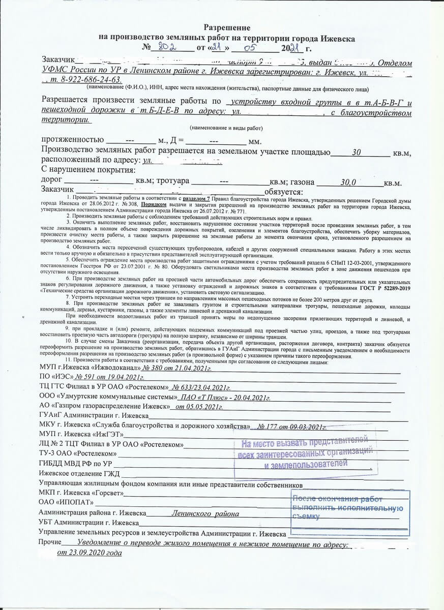 - Получение разрешение на земляные работы (разрешение на строительство входной группы в нежилое помещение).