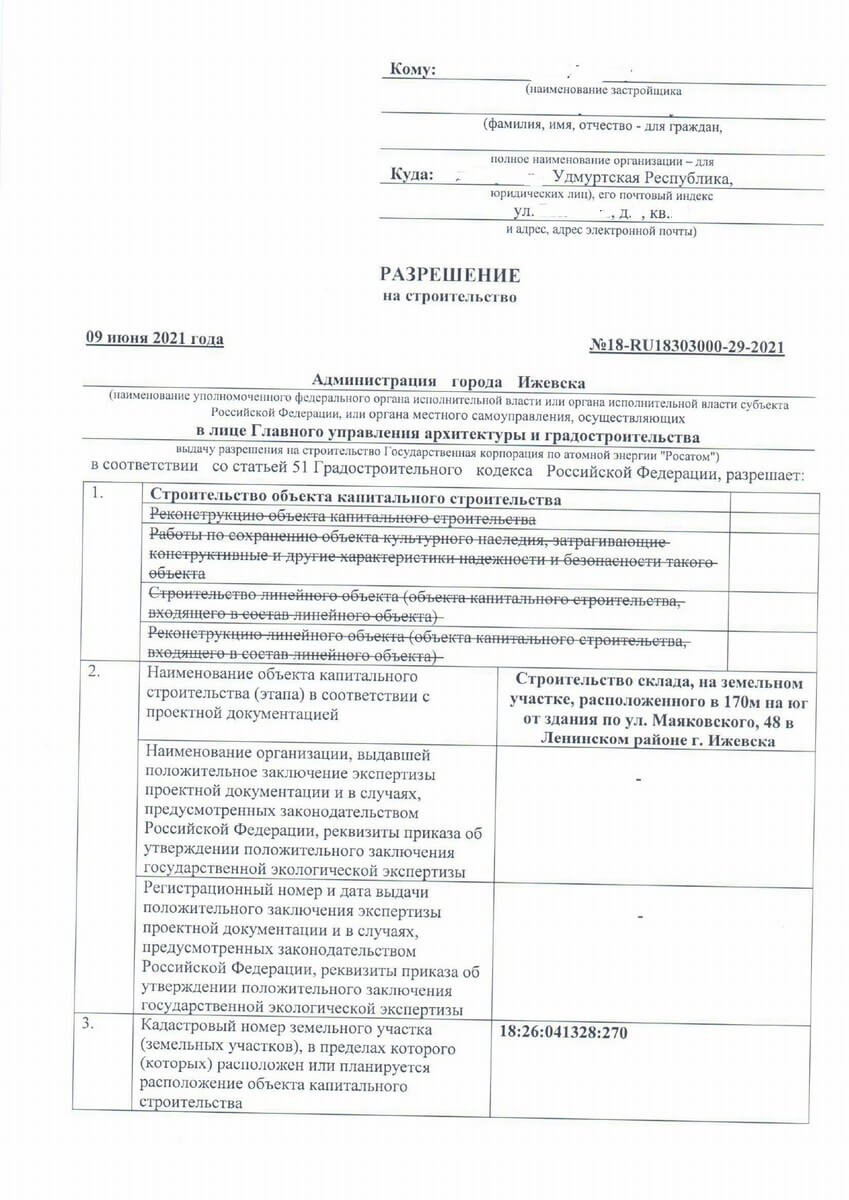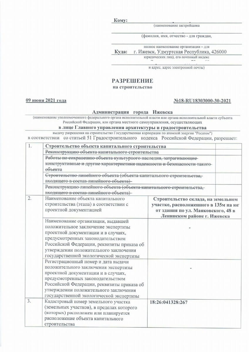 Нами получены согласования с Управлением Роспотребнадзора по Удмуртской Республике, Администрацией города Ижевска. На основании проектной и сопроводительной документации Администрация города в лице Главного управления архитектуры и градостроительства города Ижевска выдало разрешение на строительство двух складов в городе Ижевске!