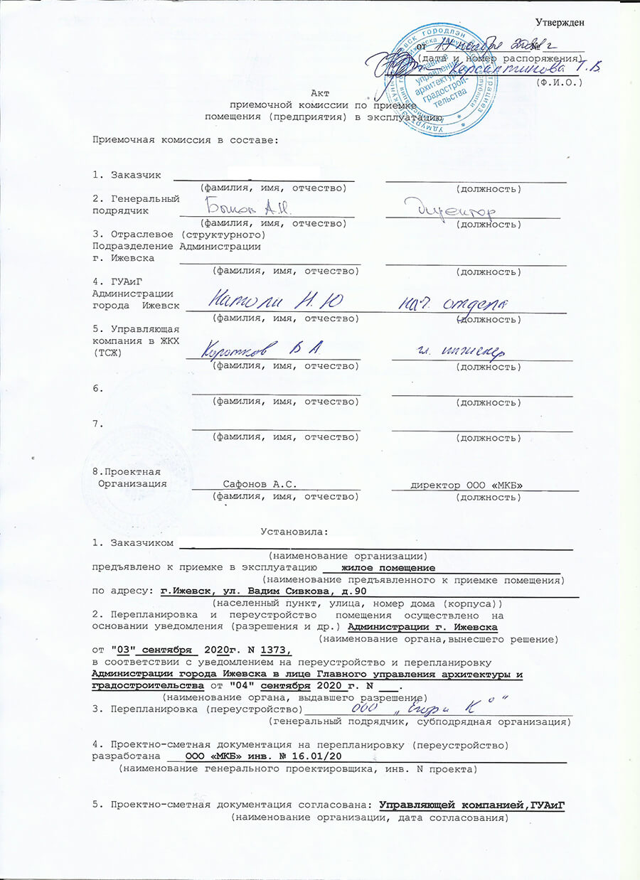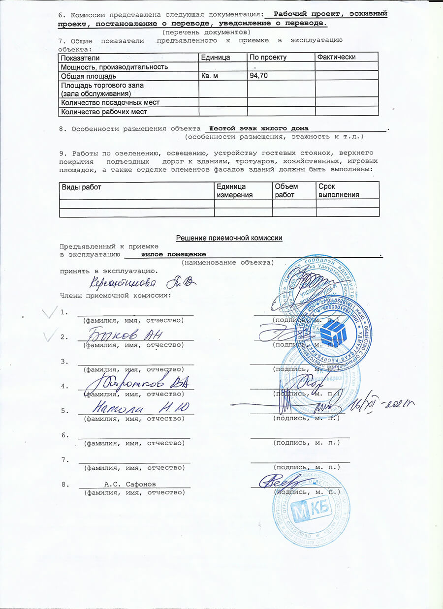 Нами были выполнены все условия договоренностей, а наш заказчик получил большую жилую квартиру с панорамным остеклением на последнем этаже жилого дома. На этом объекте мы собрали все необходимые исходные данные для проектирования и дальнейшего перевода нежилого помещения в жилое, выполнили проектные работы, согласовали рабочий проект, получили одобрение от СЭС и РОСПОТРЕБНАДЗОРа по УР, получили постановление о переводе и в дальнейшем ввели в эксплуатацию помещение как жилое.