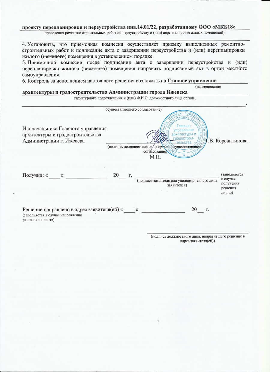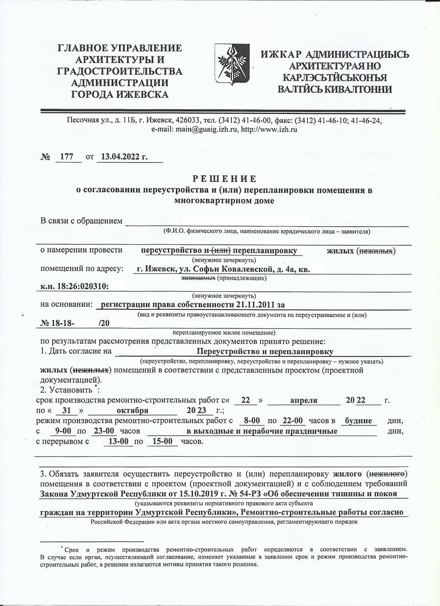 Получено разрешение на проведение строительно-монтажных работ по перепланировке жилого помещения, расположенного в многоквартирном доме по ул. Софьи Ковалевской, 4А в Индустриальном районе города Ижевска. Нашими специалистами была выполнена работа под ключ. Проектная группа изготовила проект, с учетом пожеланий заказчика и в соответствии с действующими нормативами. Наши специалисты согласовали проект с заинтересованными службами. На основании проделанной работы, специалистами OOO «Архитектурная мастерская Шайхутдинова и Ко» и собранного пакета документов Администрация города выдала решение о согласование перепланировки (разрешения на перепланировку).