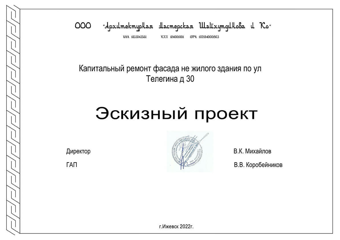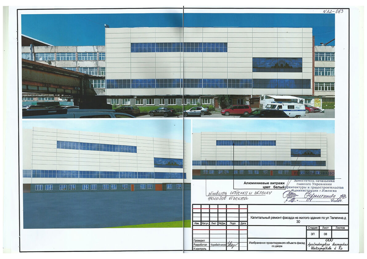 С такой задачей мы справились. Мы разработали и согласовали эскизный проект с целью капитального ремонта фасада нежилого здания по ул. Телегина, 30 в Ленинском районе города Ижевска.