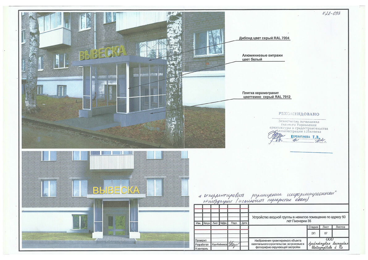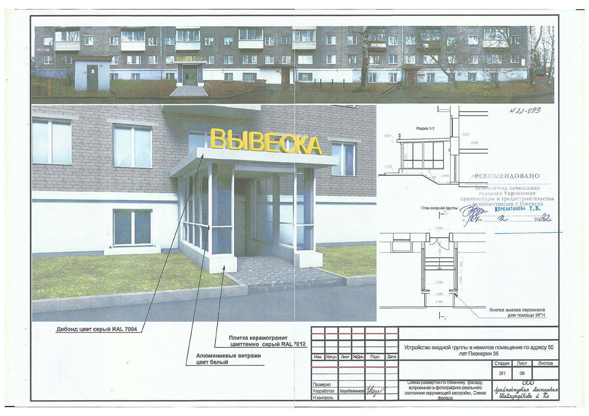Для заказчика мы разработали и согласовали эскизный проект, с целью капитального ремонта фасада цокольного этажа и устройства дополнительной входной группы в нежилое помещение по ул. 50 лет Пионерии, 35 в Октябрьском районе города Ижевска.