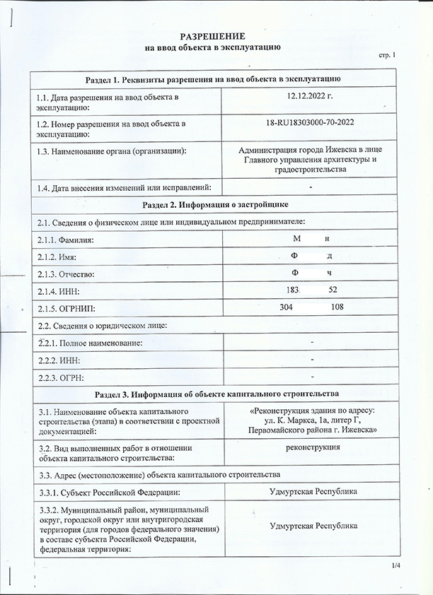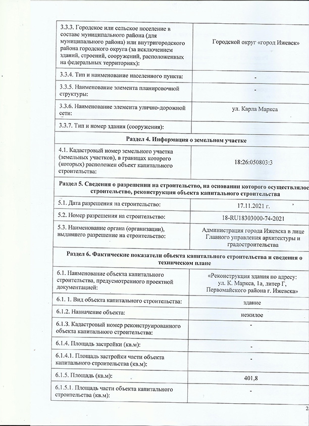 Ввод в эксплуатацию объекта: «Административного здания по ул. Карла Маркса, 1а в городе Ижевск» после завершения работ по реконструкции