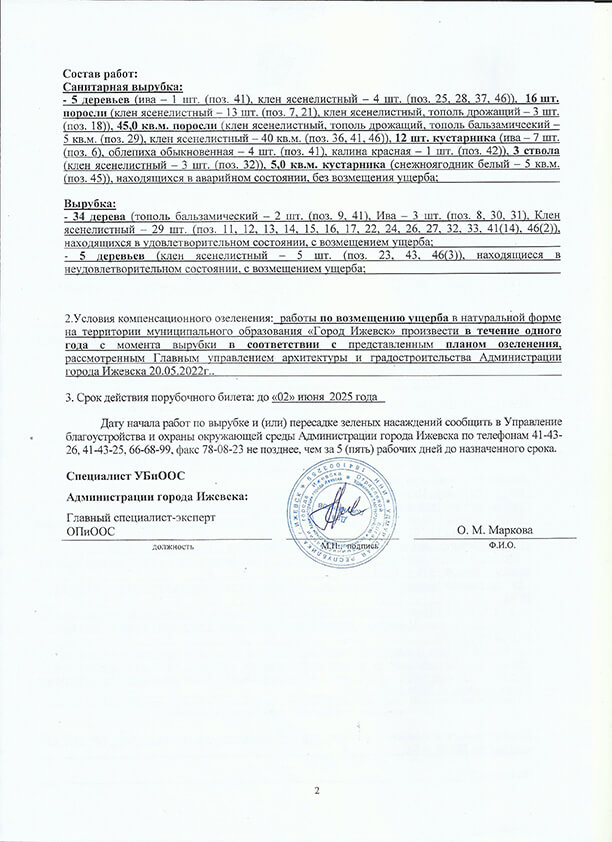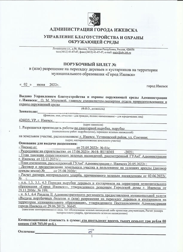 Часто перед началом работ по строительству какого-либо объекта необходимо выполнить подготовительные работы. То есть освободить земельный участок от существующих коммуникаций или зеленых насаждений. Вот и наш заказчик столкнулся с этой проблемой. Обратившись в OOO «Архитектурная мастерская Шайхутдинова и Ко» с этим вопросом, мы помогли выйти из данной ситуации с наименьшими потерями. Совместно с заказчиком мы разработали план таксации и план озеленения. Мы убедили заказчика, что верным решением в данном случае, будет не просто спилить старые и аварийные деревья, но и высадить взамен новые «культурные» породы деревьев. С нашим мнением согласилась и Администрация города Ижевска, предоставив порубочный билет и разрешение на пересадку зеленых насаждений.