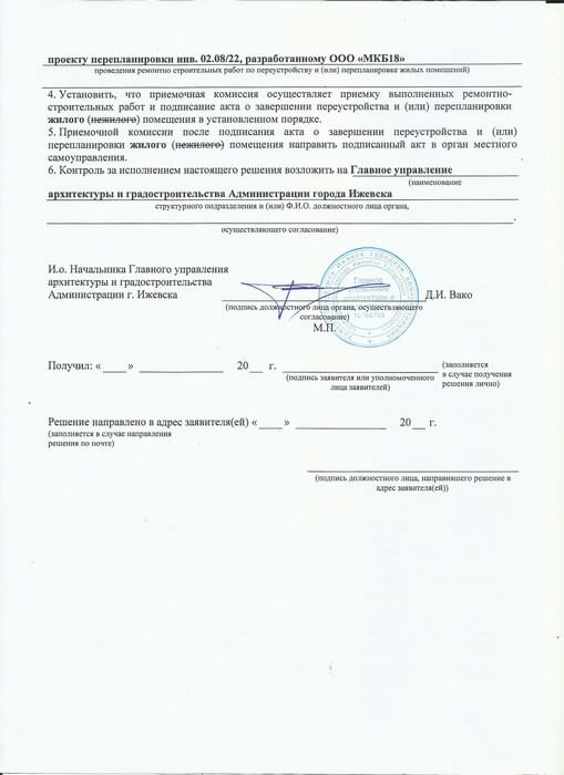 Нами для нашего Заказчика получено очередное разрешение на перепланировку квартиры в Октябрьском районе города Ижевска. Менеджеры OOO «Архитектурная мастерская Шайхутдинова и Ко» подготовили и собрали комплект документов, наша проектная группа изготовила проект перепланировки и согласовала его с заинтересованными службами. И на основании комплекта документов, проекта мы получили разрешение на перепланировку от Администрации города Ижевска в лице Главного управления архитектуры и градостроительства.