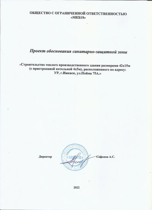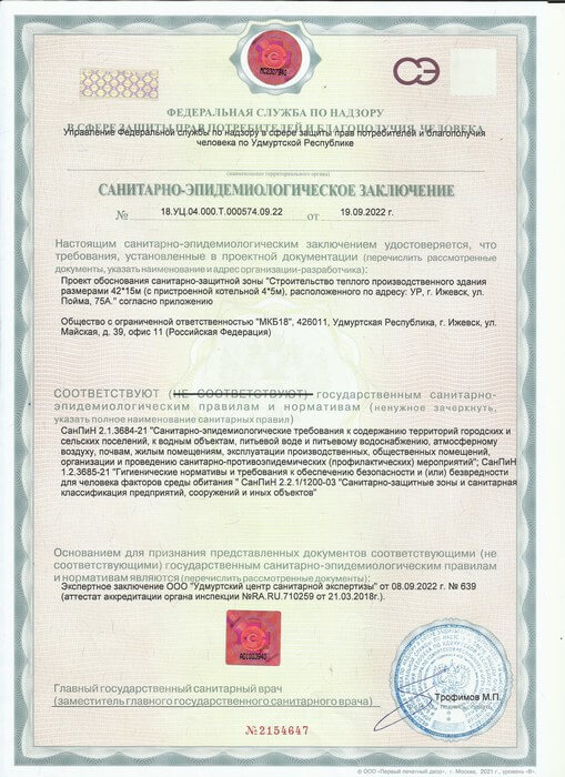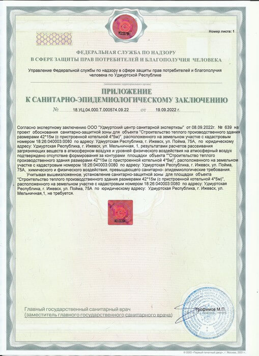 Мы получили санитарно-эпидемиологические заключения на соответствие государственным санитарно-эпидемиологическим правилам и нормативам от Управления Федеральной службы по надзору в сфере защиты прав потребителей и благополучия человека по Удмуртской Республике (Управление Роспотребнадзора по Удмуртской Республике). Проект обоснования установления санитарно-защитной зоны на земельные участке для производственного здания по ул. Пойма, 75А в городе Ижевске. Наша проектная документация была разработана в соответствие с Постановлением Правительства РФ от 3 марта 2018 г. N 222 "Об утверждении Правил установления санитарно-защитных зон и использования земельных участков, расположенных в границах санитарно-защитных зон".