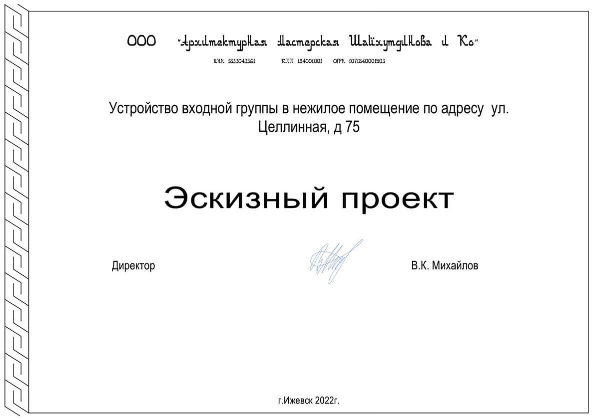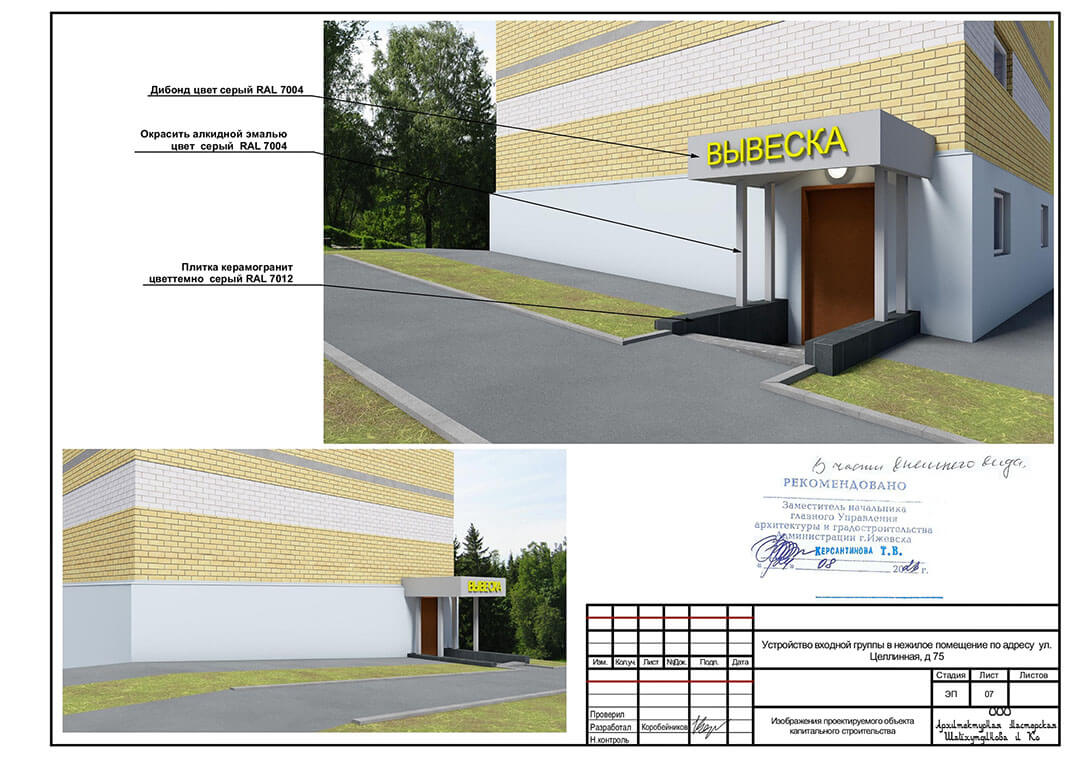 Очередной эскизный проект выполнила наша команда. Нам было поручено разработать и согласовать эскизный проект на устройство входной группы в нежилое помещение по адресу: г. Ижевск, ул. Целинная, 75 в Ленинском районе. Наш архитектор, совместно с конструктором, немного поразмыслив разработали эскизный проект, по техническому заданию заказчика. Идею заказчика отразили на бумаге и согласовали с Главным управлением архитектуры и градостроительства администрации города Ижевска.