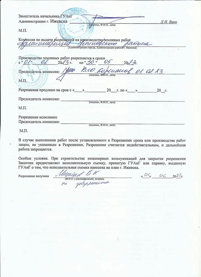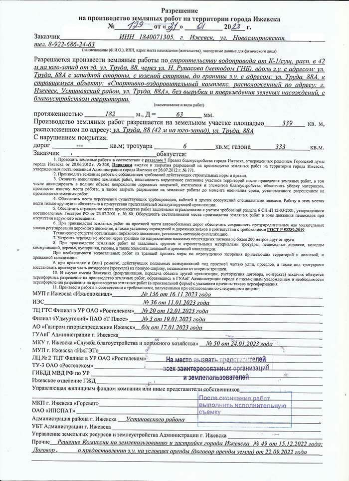 Получено разрешение на производство земляных работ для прокладки водопровода и канализации к спортивно-оздоровительному комплексу по ул. Труда! На объекте специалисты «Архитектурной мастерской Шайхутдинова и Ко» выполнили комплекс мероприятий «под ключ». Наша работа заключалась в полном сопровождение работы по подключению нового объекта к сетям водоснабжения и водоотведения. Свою работу мы начали с получения технических условий от МУП «Ижводоканал» на подключение к сетям водоснабжения, водоотведения, обновления топографической подосновы под будущее проектирование. Выполнили проектную документацию, включая наружные сети и внутренние сети водоснабжения и водоотведения, согласовав с заинтересованными службами. Получили земельный отвод под будущую трассу водопровода и канализацию. По окончанию работы, мы получили разрешение от Администрации города на проведение земляных работ на территории города Ижевска.
