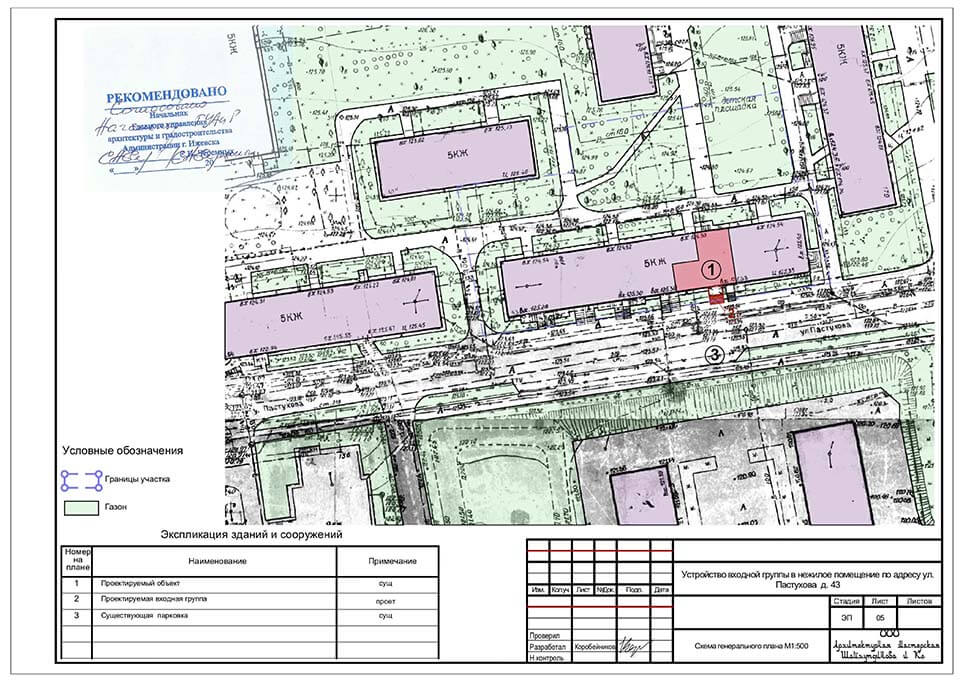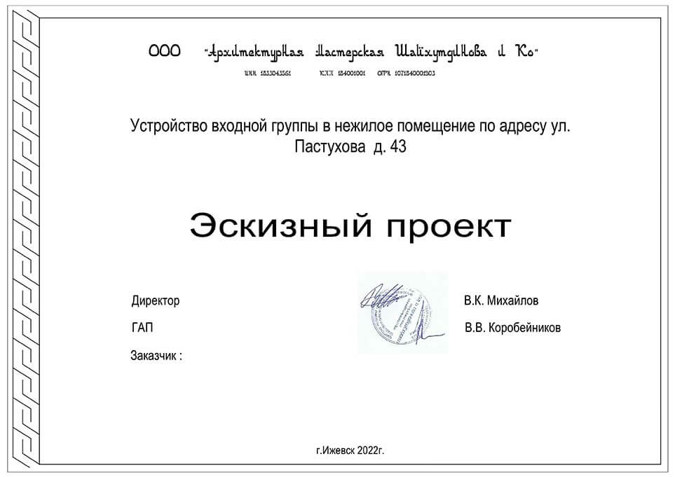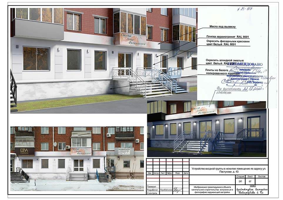 Со своей задачей мы справились. Мы разработали и согласовали эскизный проект входной группы в нежилое помещение по ул. Пастухова, 43 в Первомайском районе города Ижевска. Заказчик поблагодарил за выполненную нами работу.
