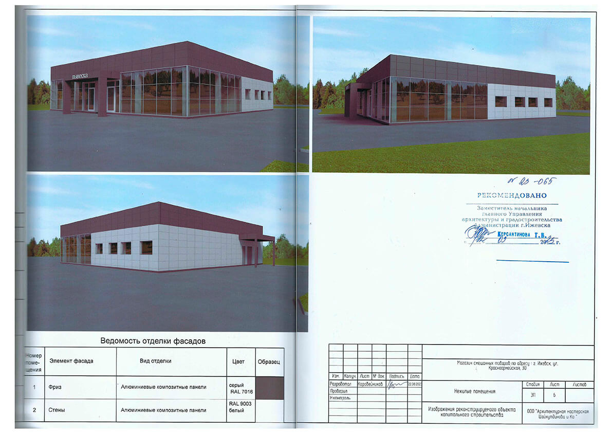 По просьбе заказчика, мы разработали эскизный проект на строительство магазина смешанных товаров, расположенного по адресу: г. Ижевск, ул. Красноармейская, 30 в Первомайском районе. Наша команда в составе архитектора и технолога, совместно с конструктором, предложили вариант магазина, в соответствии с пожеланиями заказчика. По прошествии нескольких рабочих совещаний получилось создать объект, который украсит и город и будет соответствовать пожеланию заказчика. В дальнейшем эскизный проект был согласован с Главным управлением архитектуры и градостроительства администрации города Ижевска.