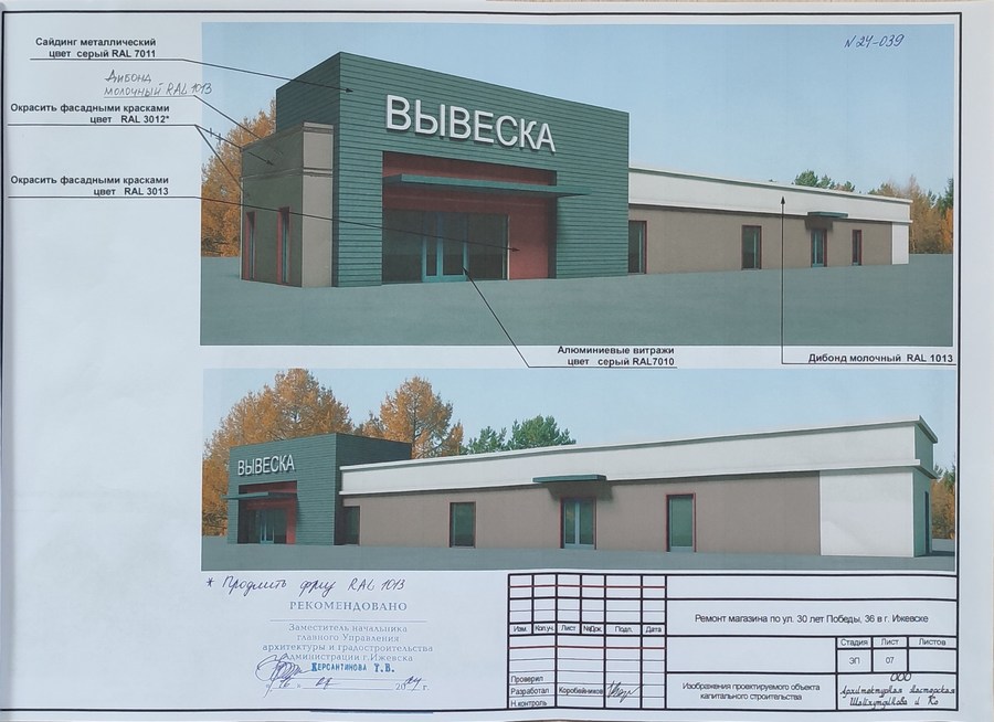 Мы разработали эскизный проект на строительство ремонт фасада магазина, расположенного по адресу: УР, г. Ижевск, ул. 30 лет Победы, 36 в Октябрьском районе. Наша команда в составе архитектора и технолога, совместно с конструктором, предложили несколько вариантов внешнего облика будущего здания и планировок в соответствии с пожеланиями заказчика. По прошествии, нескольких рабочих совещаний получилось создать объект, который украсит и город и будет соответствовать пожеланию заказчика. В дальнейшем эскизный проект согласовали с Главным управлением архитектуры и градостроительства администрации города Ижевска.