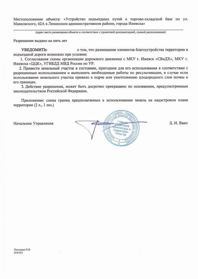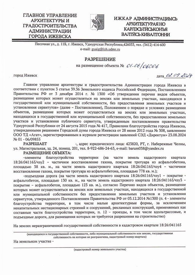 Для нашего заказчика мы выполнили работы по получению разрешения на отвод земельного участка от Администрации города Ижевска на устройство проездов и благоустройство земельного участка по адресу: г. Ижевск, ул. Маяковского, 42а, прилегающего к объекту Заказчика.