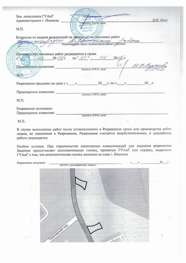 Получено разрешение на производство земляных работ, по устройству заезда к земельному участку, на котором заказчик планирует строительство торгового центра по адресу: г. Ижевск, Карлутская набережная, 11. На объекте специалисты «Архитектурной мастерской Шайхутдинова и Ко» выполнили комплекс мероприятий «под ключ». Наша работа заключалась в документальном сопровождении работы. Мы выполнили проектную документацию, согласовав с заинтересованными службами. По окончании работ мы получили разрешение от Администрации города на проведение земляных работ на территории города Ижевска.