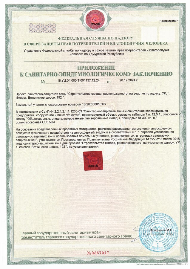 Два проекта, с первого раза и без замечаний, получили санитарно-эпидемиологические заключения на соответствие государственным санитарно-эпидемиологическим правилам и нормативам от Управления Федеральной службы по надзору в сфере защиты прав потребителей и благополучия человека по Удмуртской Республике (Управление Роспотребнадзора по Удмуртской Республике). Проекты на земельные участки по установлению санитарно-защитной зоны для складов по Воткинскому шоссе, 192 в городе Ижевске и проект по установлению санитарно-защитной зоны для производственного здания по Воткинскому шоссе, 192А в городе Ижевске!