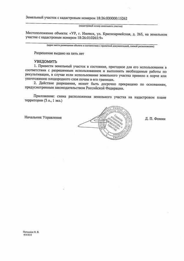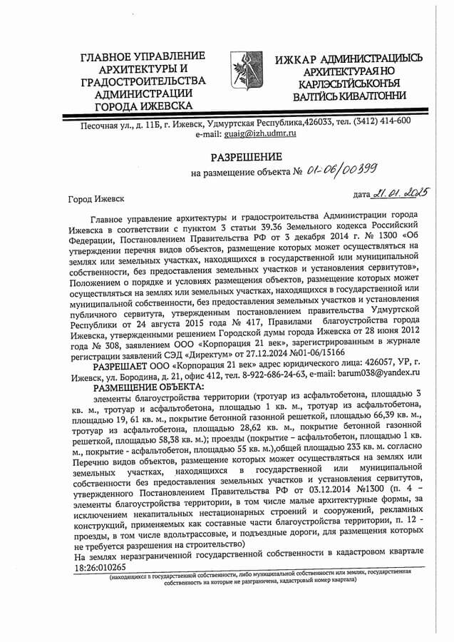 Для нашего заказчика мы выполнили работы по получению разрешения на отвод земельного участка от Администрации города Ижевска на благоустройство земельного участка и устройство подъездной дороги к земельному участку по ул. Красноармейская 265 в Октябрьском районе города Ижевска, прилегающего к объекту Заказчика.