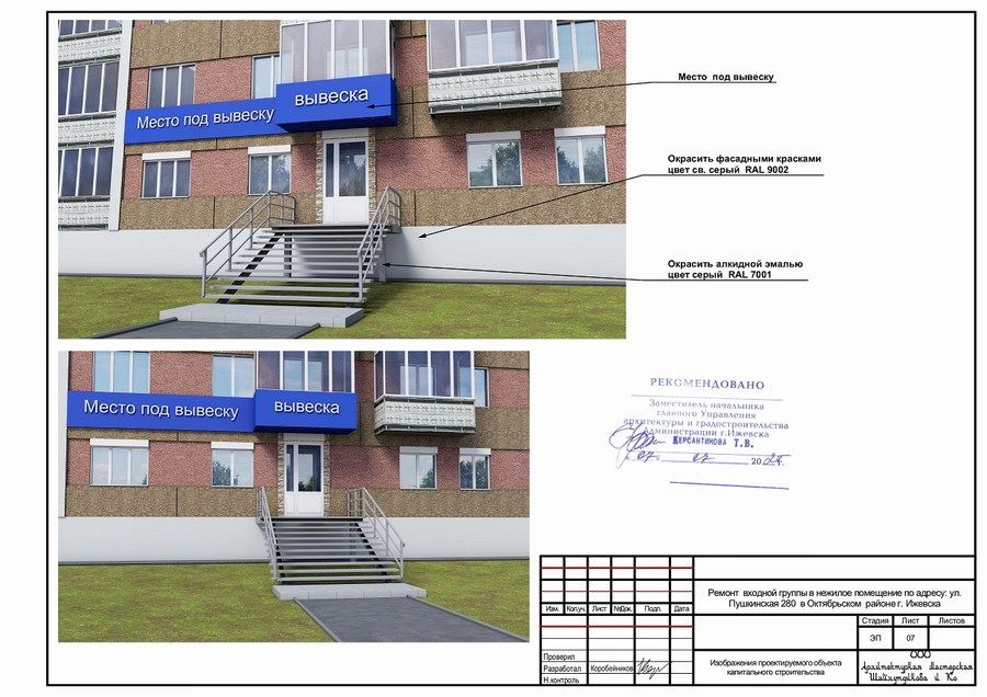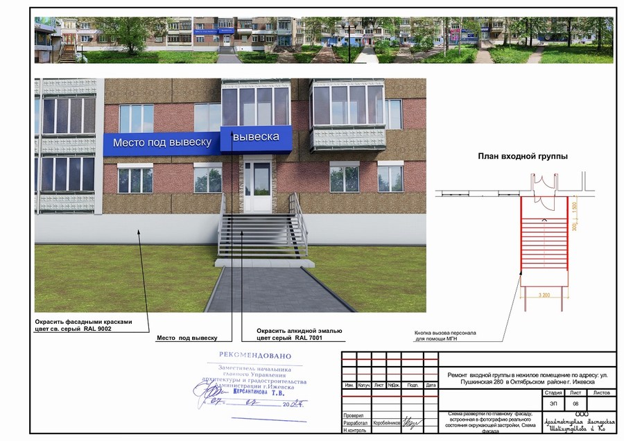 Мы разработали эскизный проект на капитальный ремонт входной группы магазина, расположенного по адресу: УР, г. Ижевск, ул. Пушкинская, 280 в Октябрьском районе. Наша команда в составе архитектора и технолога, совместно с конструктором, предложили несколько вариантов внешнего облика будущего здания и планировок в соответствии с пожеланиями заказчика. По прошествии, нескольких рабочих совещаний получилось создать объект, который украсит и город и будет соответствовать пожеланию заказчика. В дальнейшем эскизный проект согласовали с Главным управлением архитектуры и градостроительства администрации города Ижевска.
