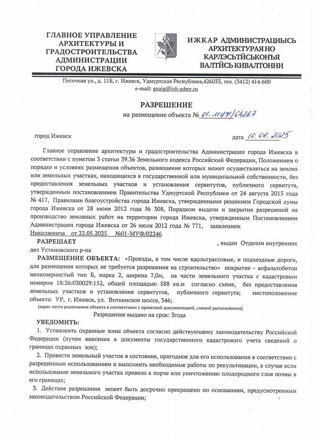 Для нашего заказчика мы выполнили работы по получению разрешения на отвод земельного участка из муниципальной собственности от Администрации города Ижевска под благоустройство и устройство подъездной дороги к земельному участку по Воткинскому шоссе, 346 в Ленинском районе города Ижевска, прилегающего к объекту Заказчика.