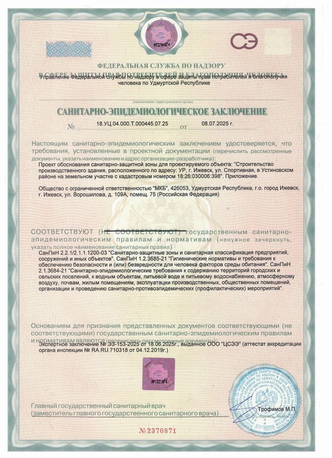 С первого раза и без замечаний, получили санитарно-эпидемиологические заключения на соответствие государственным санитарно-эпидемиологическим правилам и нормативам от Управления Федеральной службы по надзору в сфере защиты прав потребителей и благополучия человека по Удмуртской Республике (Управление Роспотребнадзора по Удмуртской Республике). Проекты на земельные участки по установлению санитарно-защитной зоны для производственного здания по ул. Спортивная в городе Ижевске!