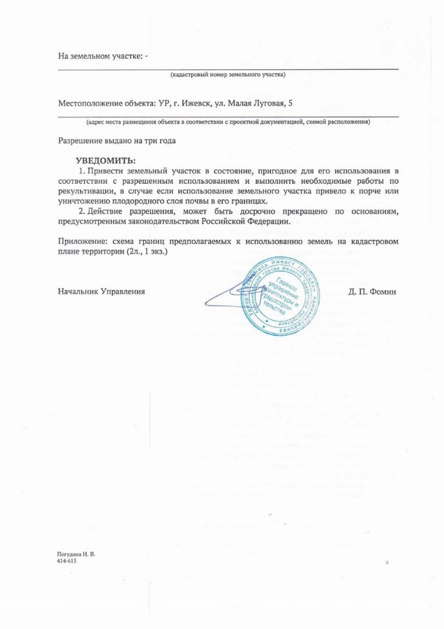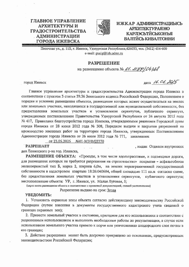 Для нашего заказчика мы выполнили работы по получению разрешения на отвод земельного участка из муниципальной собственности от Администрации города Ижевска под благоустройство и устройство подъездной дороги к земельному участку по ул. Малая Луговая, 5 в Ленинском районе города Ижевска, прилегающего к объекту Заказчика.